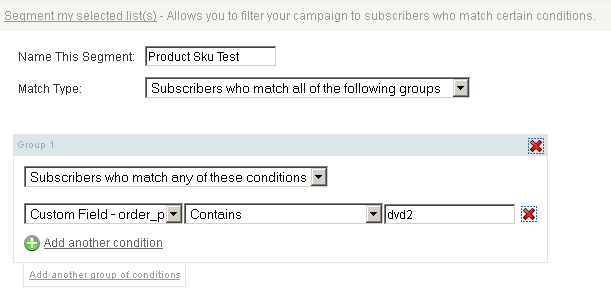 This is where you will select your extra field and enter the criteria that you want to search for in order to determine if the customer should be included on the newsletter. In our sample we have configured our segment to include just the customers who have a SKU of “dvd2″ in the their “order_product_skus” field. This will cause our test user shown above to be included when this mailing goes out. Any contact who does not have “dvd2″ on its list of SKUs will be ignored.